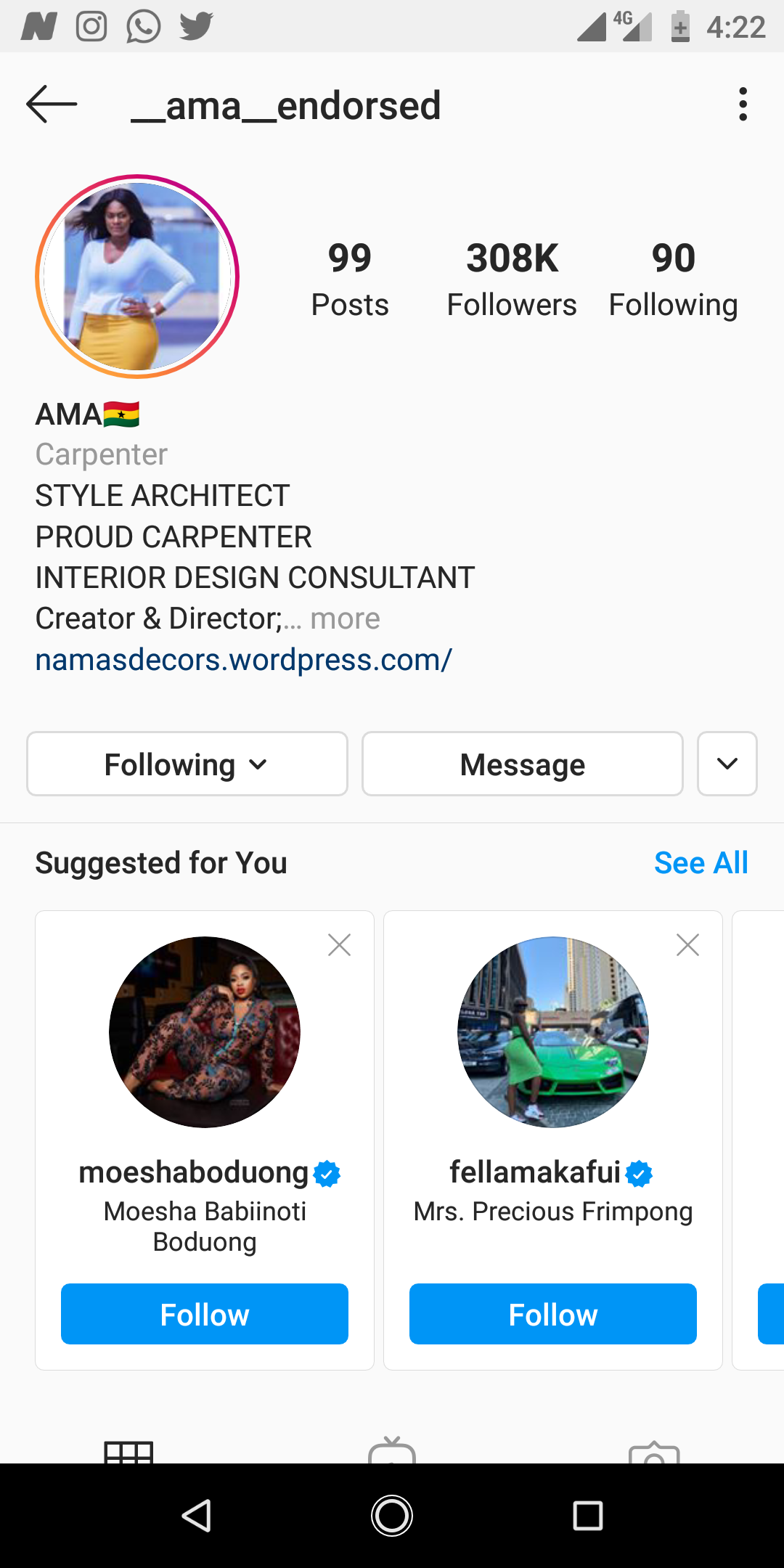 The female proud carpenter who is identified as Adzigbi Nana Ama Esime Comfort is a Ghanaian lady causing confusion on Instagram.