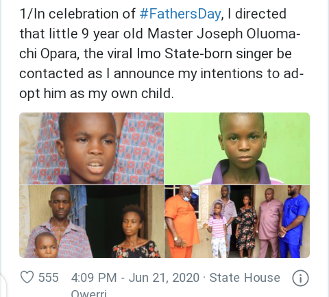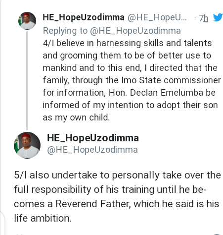 The Governor said he has sent his commissioner for information, Hon, Emelumba to inform the parents of the 9 year old of his intention to adopt him.