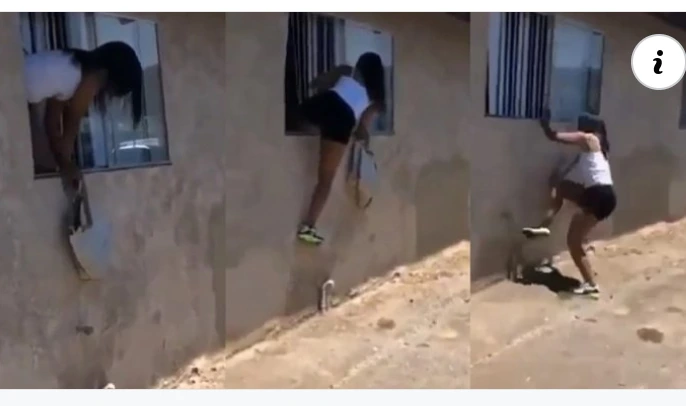 A video is currently going viral online which shows a lady trying to abscond through the window after she was busted by the wife of the man she came to visit.
