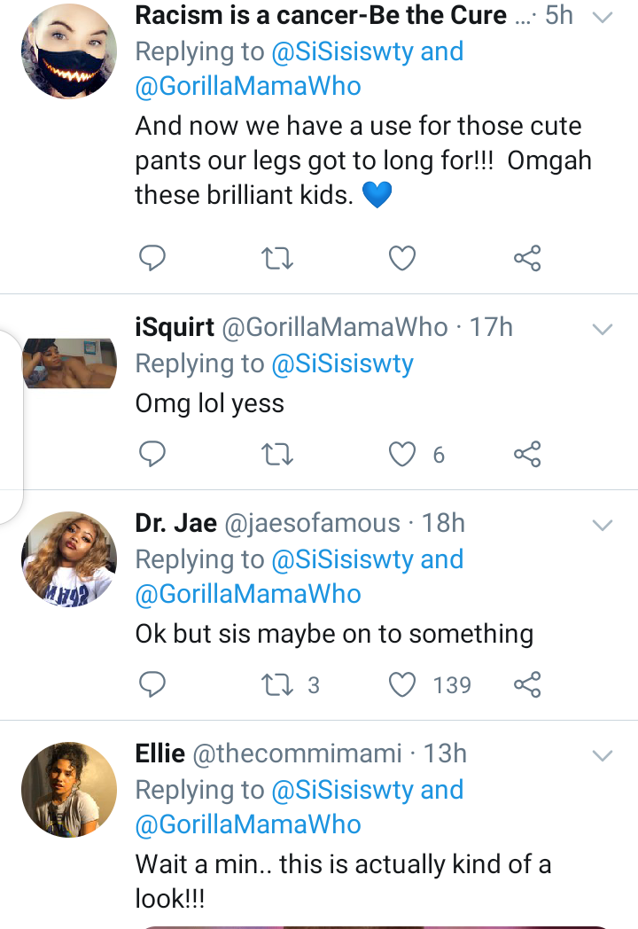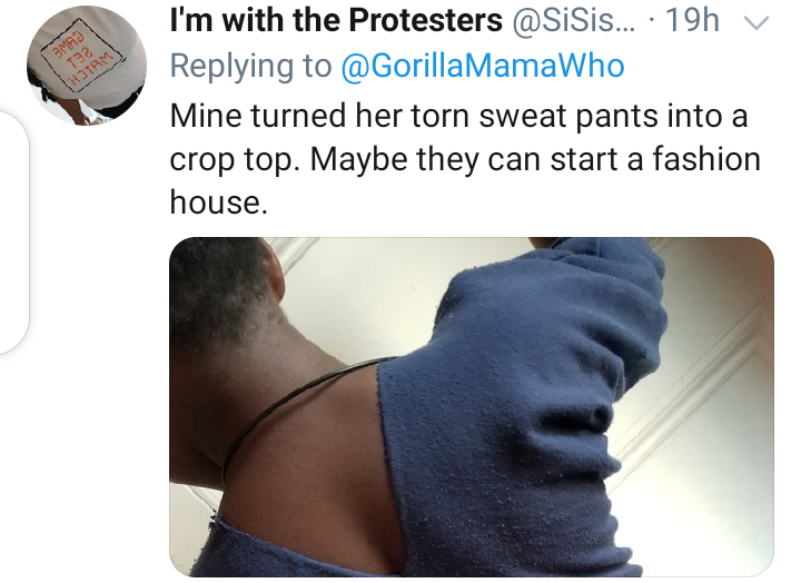 Earlier, a mother on Twitter with the username SiSisiswty posted a picture of her daughter as she turned the trouser of her sweat pants to a shirt. Who would have thought this is possible and would look good on her?. Well, this is what parents have to deal with at these lockdown times.