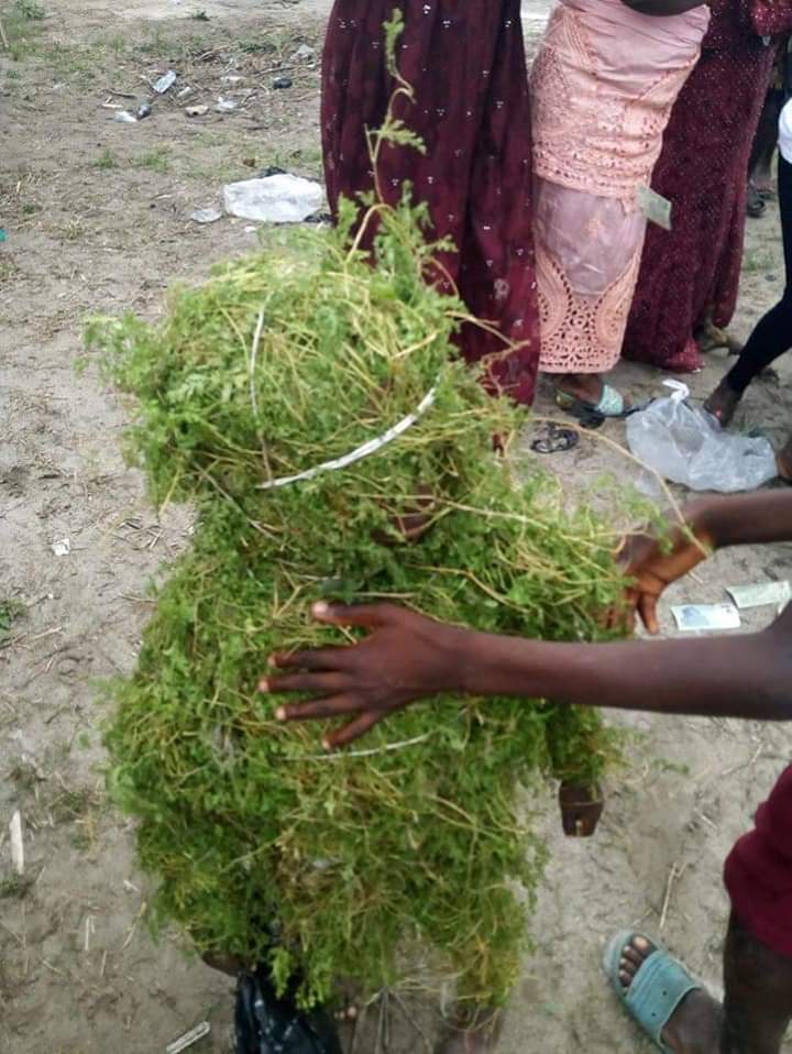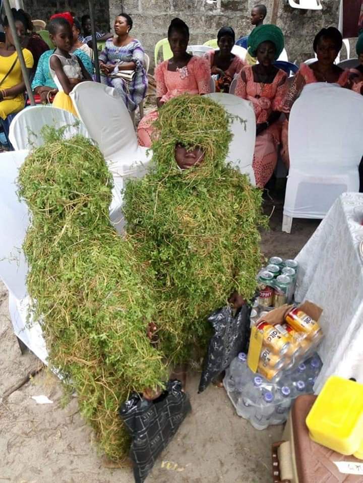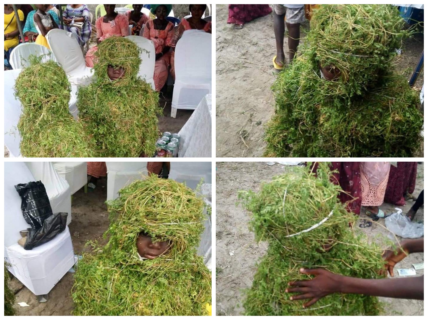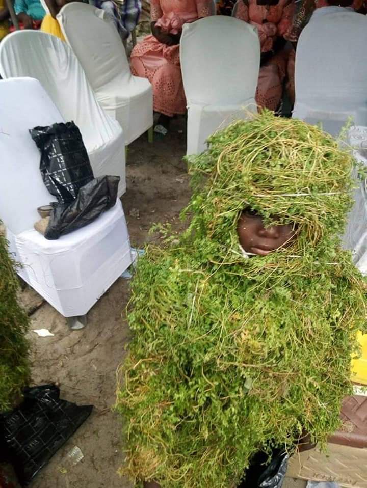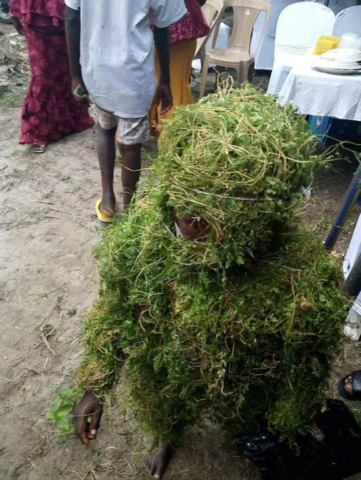 Darlington shared photos of two children covered with grasses and was holding with a poly bag.