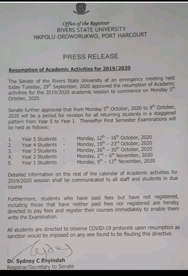 Rivers state university will officially commence or kick start their school activities today. This information was disseminated through a memo that was sent to students and staffs through the office of the registrar (Dr Sydney C. Enyindah) of the university.