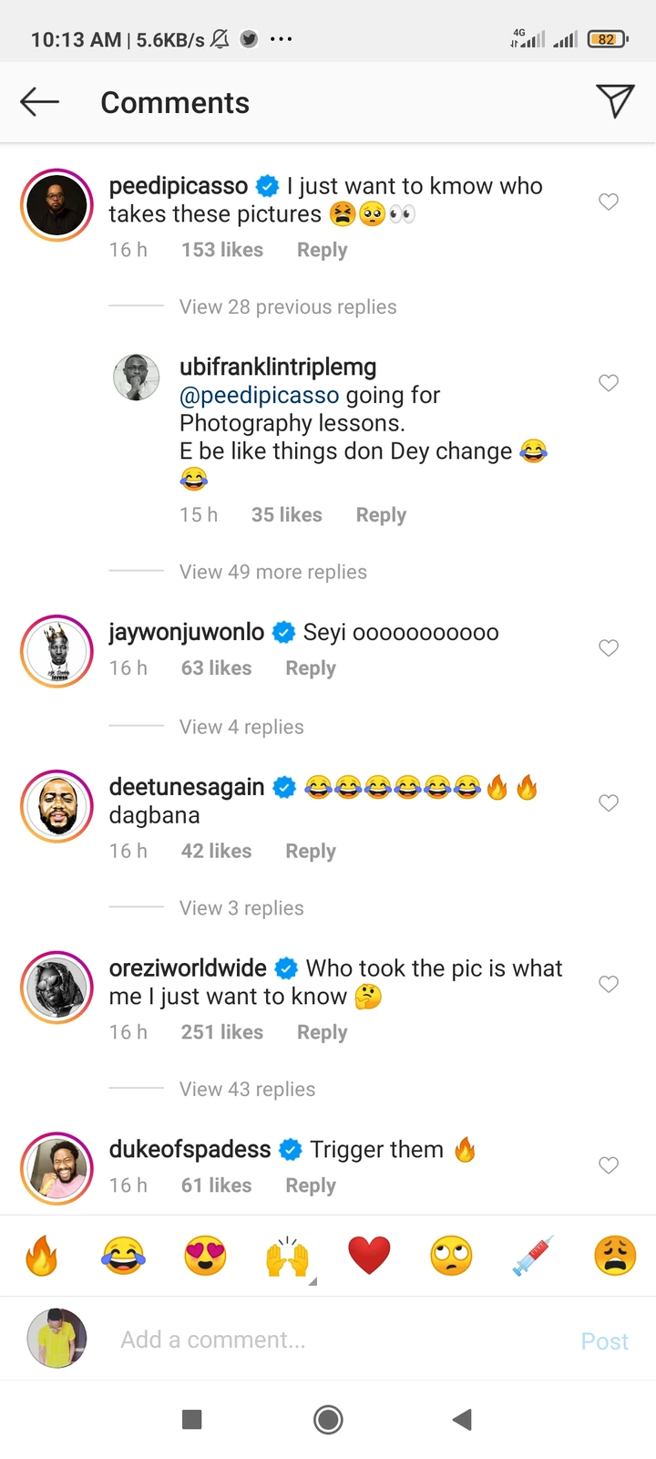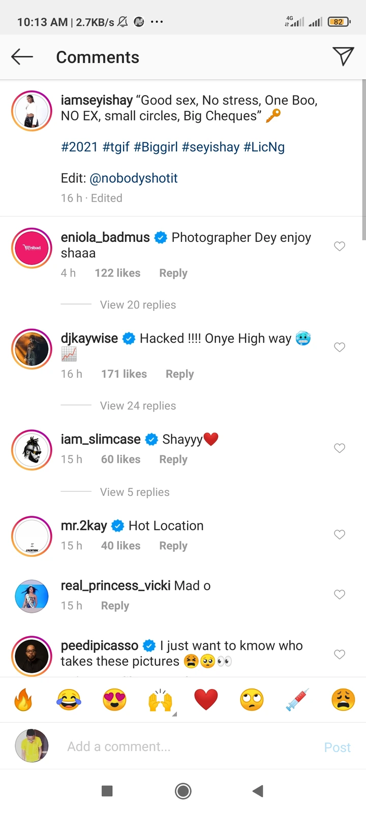 Reacting to the picture she uploaded, her fellow artists such as Eniola Badmus, DJ Kaywise, Slimcase and host of others expressed their curiosity concerning the photographer who took such sumptuous picture. See some of the reactions below;