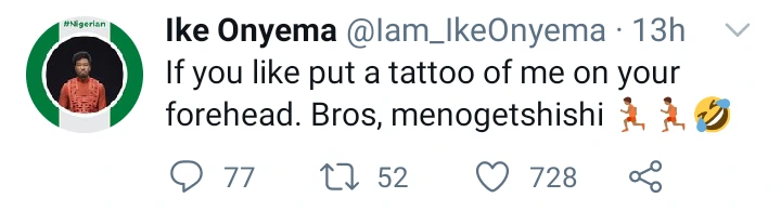 Ike Onyema has also open up that any of his fans that decide to tattoo him on their forehead should not expect anything from him. He made it clear that if any of his fans should tattoo him on their forehead he will not give any money in compensation for such act. He said.