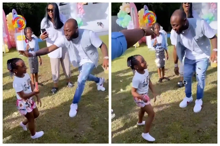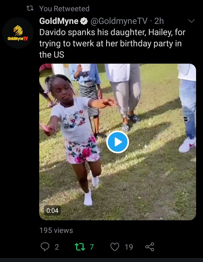 In the video showed Davido's daughter Haileywho was trying to twerk and Davido quickly rushed and cautioned her "hey don't do that, don't do that", by playfully slapping her at her back.
