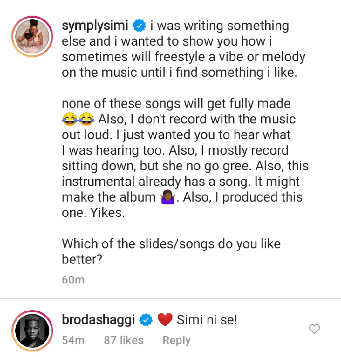 Meanwhile, she noted a couple of things she did while recording the demo which she doesn't usually do. This include her standing while recording the demo she shared. "Also, I mostly record sitting down, but she no go gree", Simi said, referring to her daughter, Adejare.